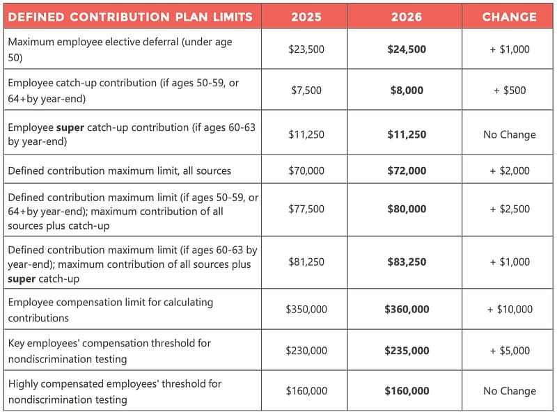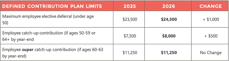 We’ve summarized the most relevant 2026 plan limits for your employees below and linked them here.